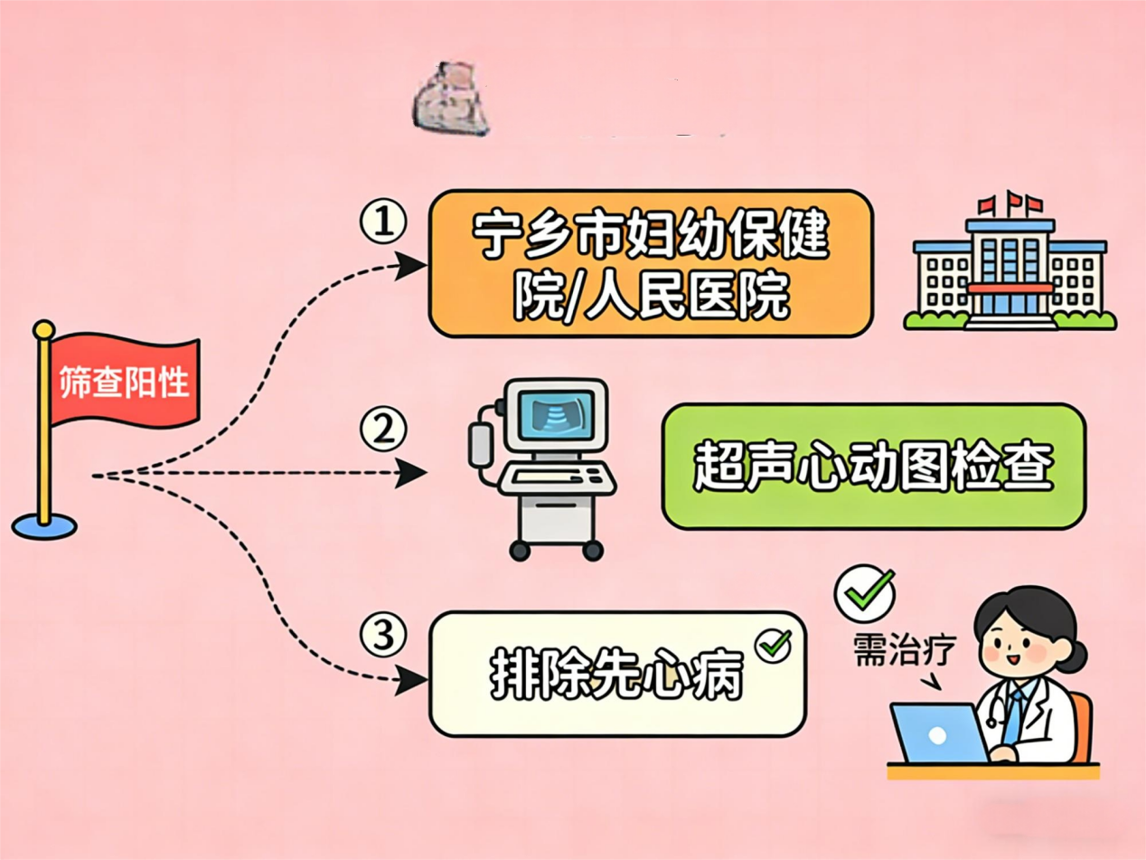 筛查结果为阳性者,应及时至新生儿先天性心脏病诊断机构(宁乡市妇幼保健院、宁乡市人民医院均为诊断机构)接受超声心动图检查,检查为阴性者,可以基本排除先天性心脏病;若超声心动图明确诊断为先天性心脏病,患儿应及时接受进一步的评估和必要的治疗。
