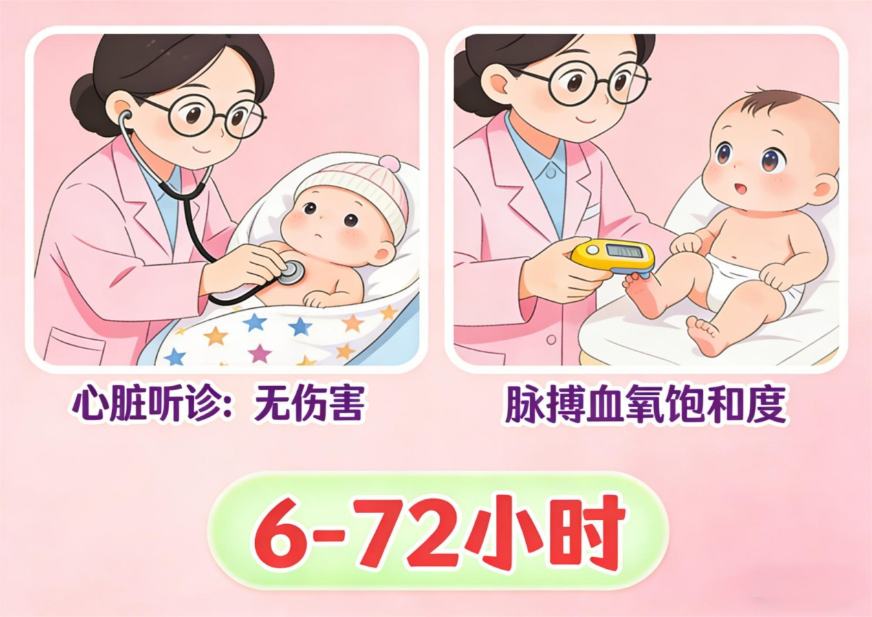 遵循知情同意的原则,在新生儿出生后6-72小时内进行,包括心脏听诊和脉搏血氧饱和度检测,这两项技术对新生儿无任何不利影响。