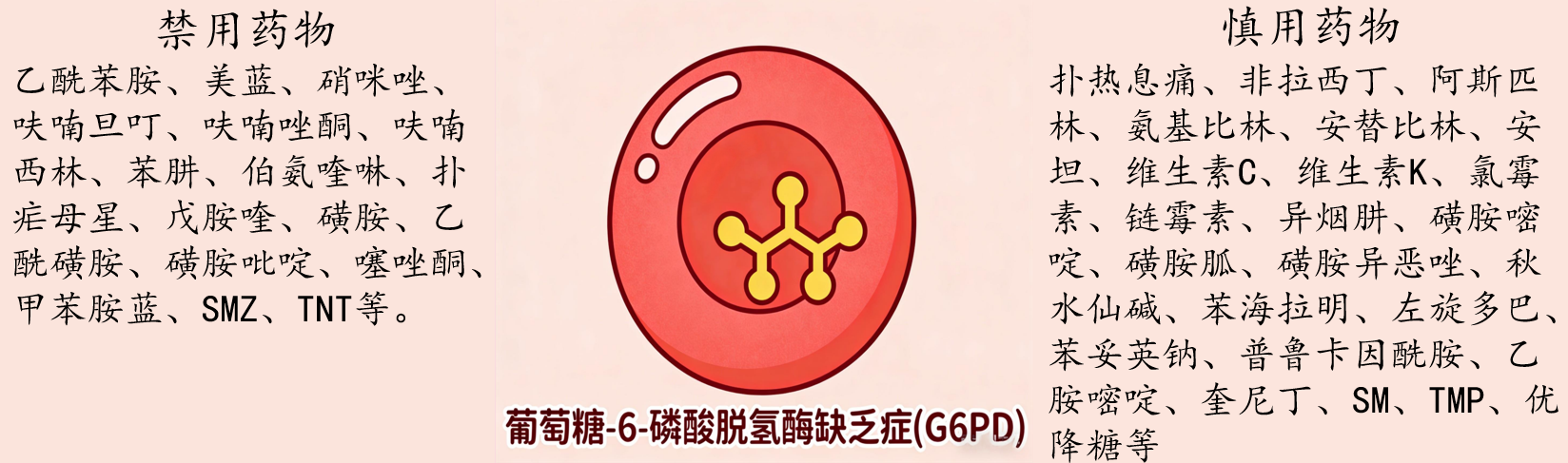 临床表现:G6PD酶活性降低,(药物、食物、感染诱发)溶血性贫血、黄疸,疾病程度与酶活性有关。